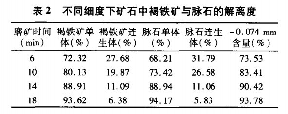該礦的主要成分是褐鐵礦,也就是氧化鐵的水化合物。經過比磁化系數測定,該礦的比磁化系數為53.2×10(-6)(cm.g-1),屬于弱磁性礦物。所以一般的弱磁和中磁選都比較難回收。根據原礦的組成,該礦的脈石解離度測定結果見表2。